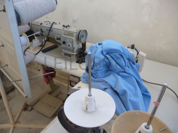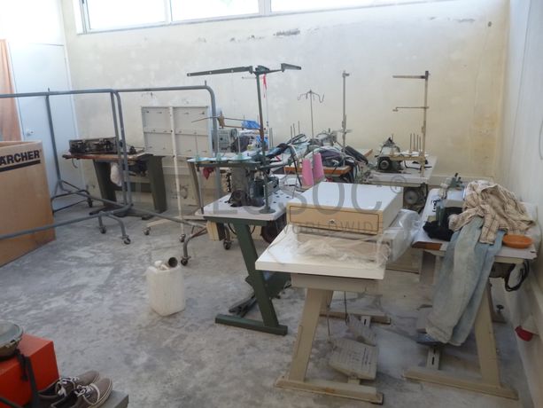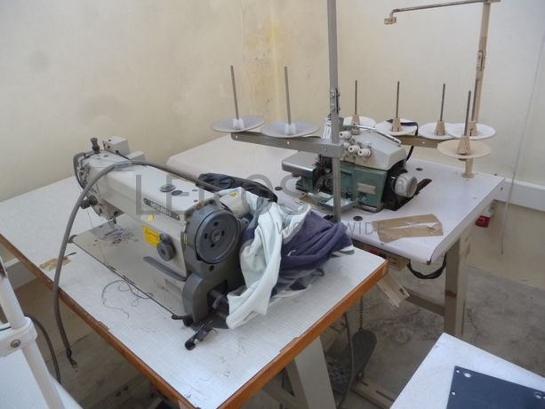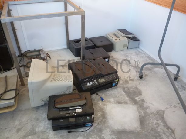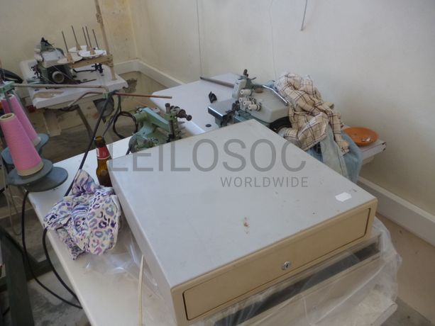 7 Máquina de costura fora de uso, prensa fora de uso, 7 impressoras fora de uso, monitor fora de uso, 2 caixas para dinheiro, 2 carrinhos para pendurados