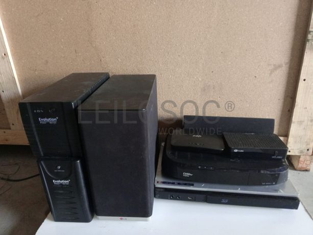 Um aparelho de som de marca LG, dois UPS's de marca Evolution e três decoders.