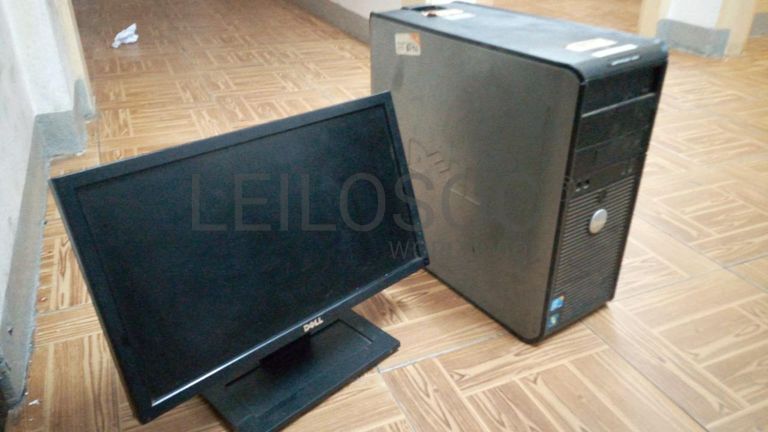 Um desktop de marca Dell Optiplex 380, core Duo, 320Gb HDD, 2Gb de RAM (avariado), um monitor e um teclado Dell.