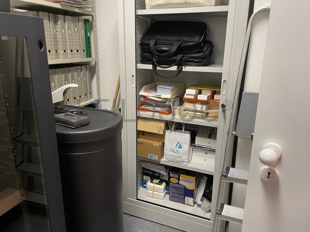 Banco de 2 lugares com mesa ao centro, 2 armário de arquivo com portas de correr, aspirador, triturador de papel, 2 aquecedores de coluna, 3 bengaleiros + 3 Secretárias, 3 cadeiras com rodas, 3 cadeiras, computador, 2 portáteis "HP", 3 módulos de gavetas, 2 armários com 2 portas de madeira, micro-ondas, armário de arquivo de portas de correr, aquecedor de coluna "BECKEN", cabide + Mesa redonda, 4 cadeiras, secretária, cadeira com rodas, módulo de 3 gavetas, aquecedor de coluna "BECKEN" + Secretária, cadeira com rodas, cadeira, módulo de 3 gavetas, bengaleiro, portátil HP + 2 Armários de arquivo com portas de correr, mesa de reuniões oval, 6 cadeiras, flipchart, televisor "Panasonic", projetor "NEC", balde do lixo, extintor com suporte + Armário de arquivo em madeira, estante de metal, escadote, armário de arquivo com portas de correr, armário branco com 2 portas, cenário, servidor, frigorifico "KUNFT".