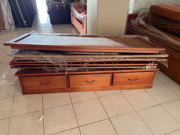 - Roupeiro de madeira castanha, de três portas e três gavetas, desmontado