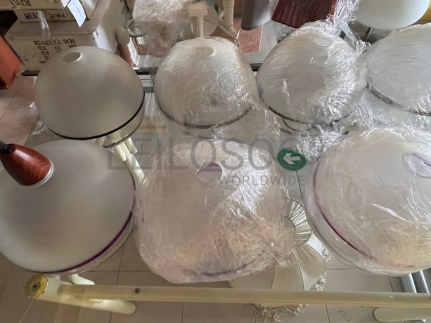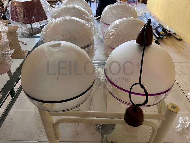 - 5 Candeeiros de teto em formato de bola em vidro com risca preta, 3 com risca roxa (faltam peças)
