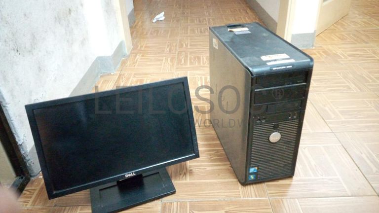 Um desktop de marca Dell Optiplex 380, core Duo, 320Gb HDD, 2Gb de RAM (avariado), um monitor e um teclado Dell.