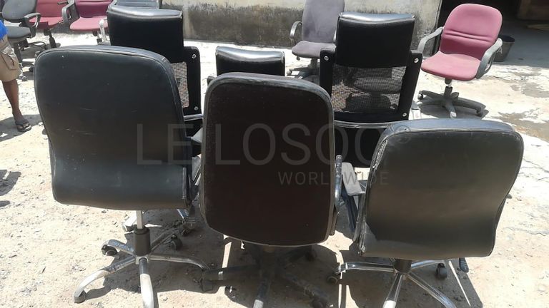 Seis cadeiras de escritório giratórias.