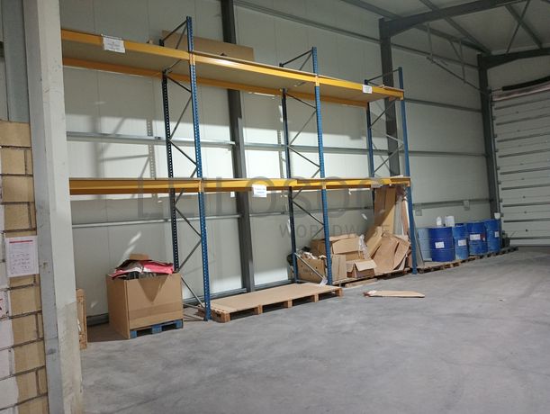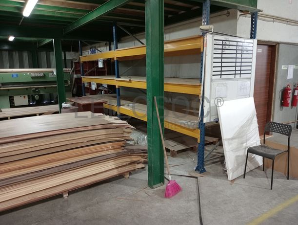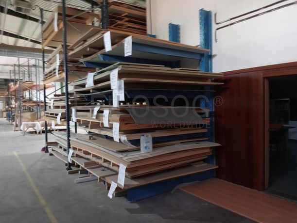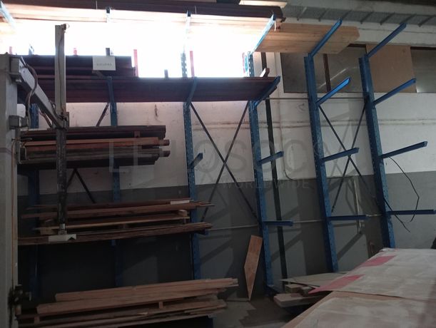 Máquina de cintar manual, 2 carros de apoio, 24 módulos de estante industrial, 2 bancos de carpinteiro, 3 estantes cantilever, lote de vigas em madeira, soalho, placas.