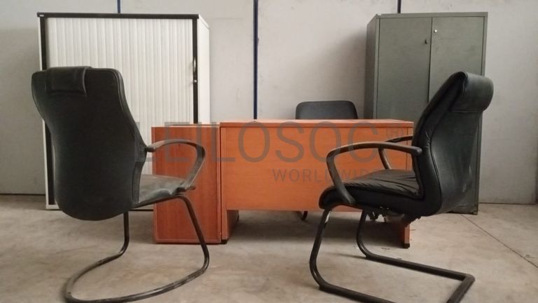 Uma secretária, três cadeiras fixas, um bloco rodado e dois armários