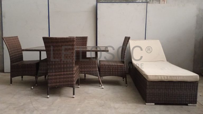 Uma mesa de jardim com tampo de vidro, quatro cadeiras e uma cama de jardim.