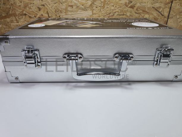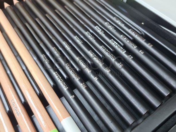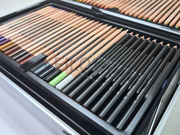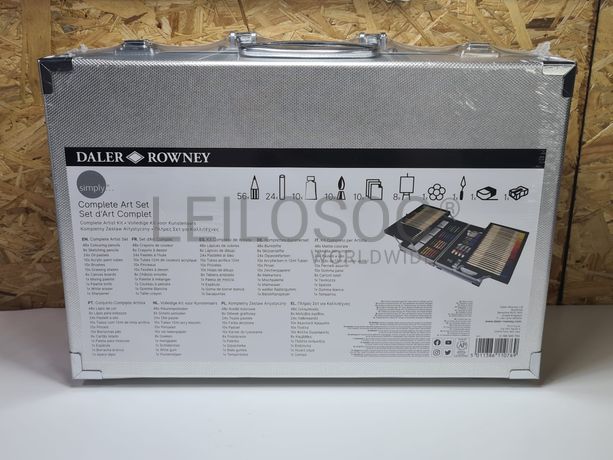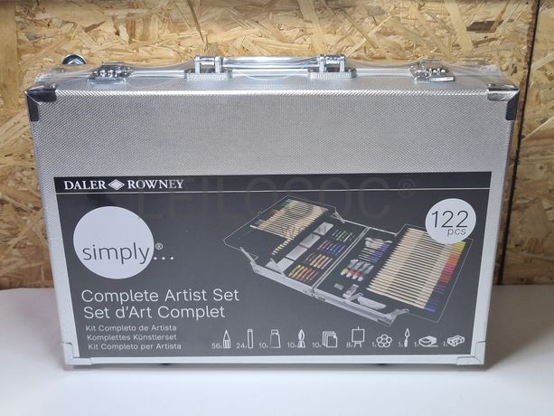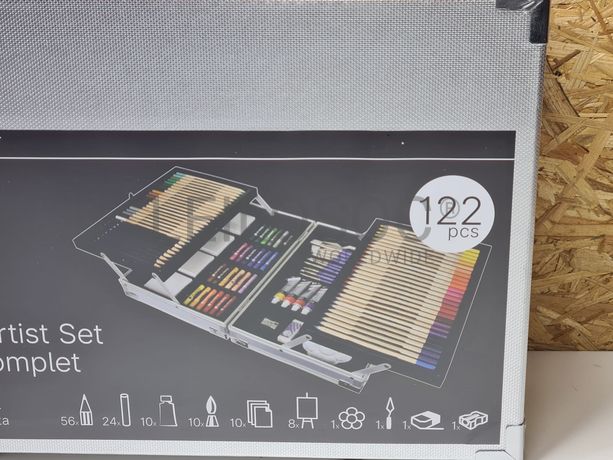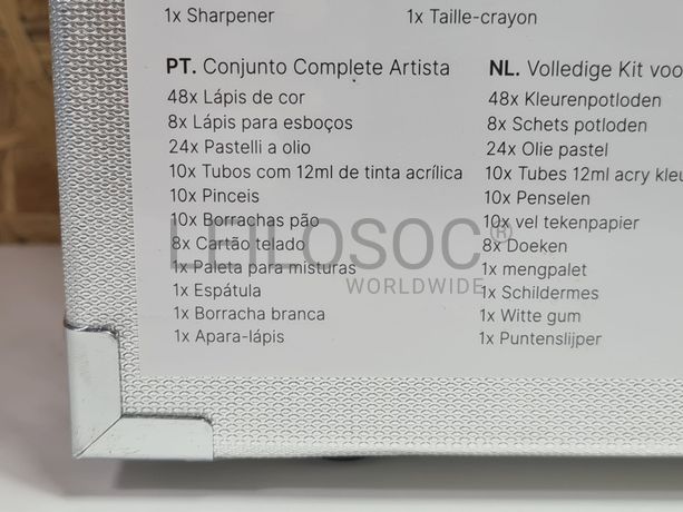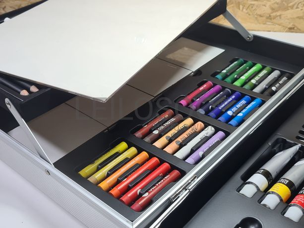 Conjunto de pintura arte completo, de 122 peças, em caixa de metal, com 48 lápis de cor, 8 lápis para esboços, 24 Pastel a óleo, 10 tubos com 12ml de tinta acrílica, 10 pincéis, 10 borrachas pão, 8 cartão telado, 1 paleta para misturas, 1 espátula, 1 borracha branca, 1 apara-lápis.