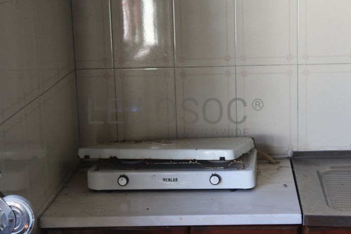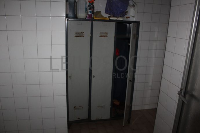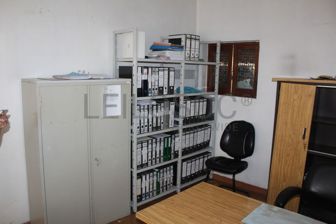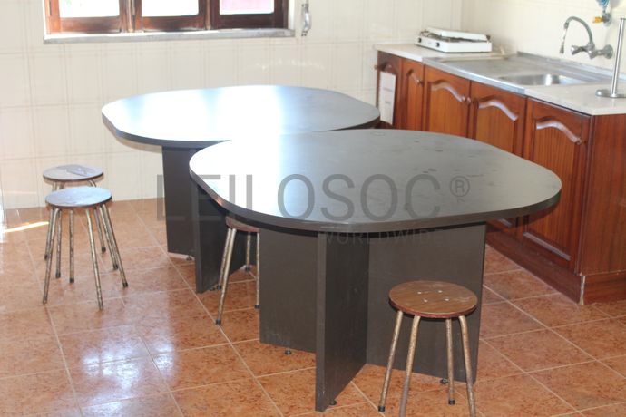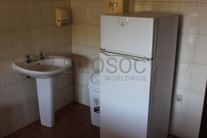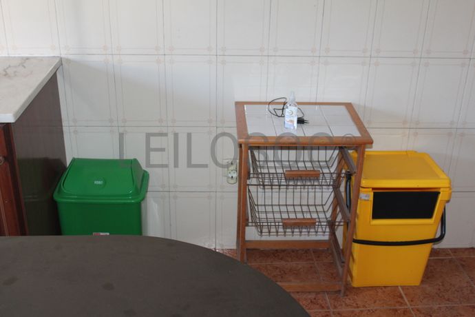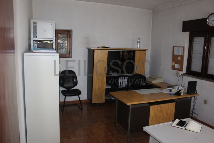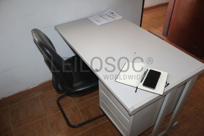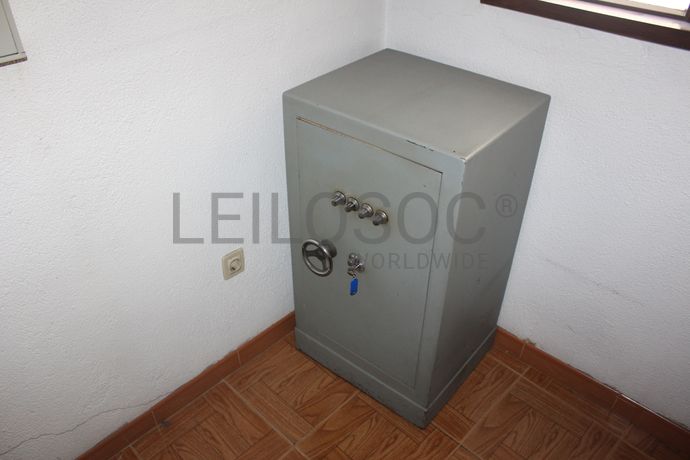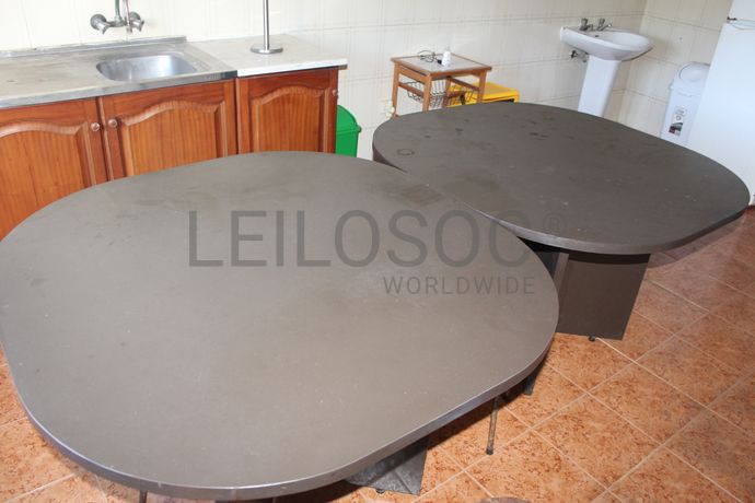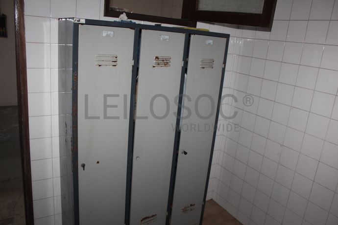 - 2 Mesas, frigorifico "INDESIT", esquentador "JUNKERS", 4 bancos, fogão de bancada a gás com 2 queimadores, 2 cacifos de 3 portas, cofre, 2 cadeiras, cadeira com rodas, 2 secretárias, mesa de apoio, armário de arquivo com 2 portas e estante, estante, armário de arquivo