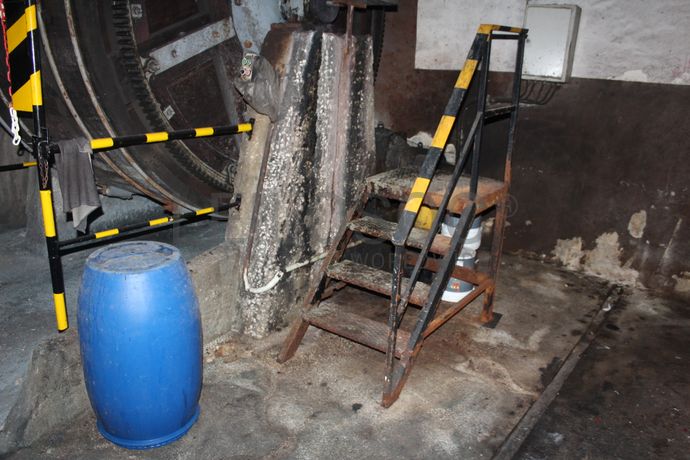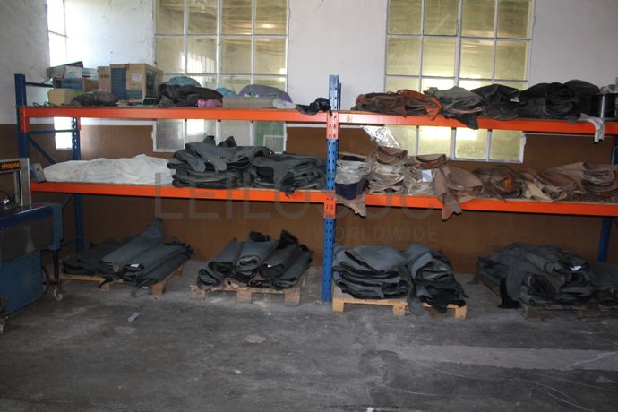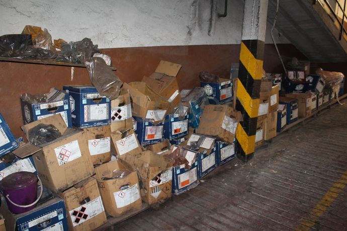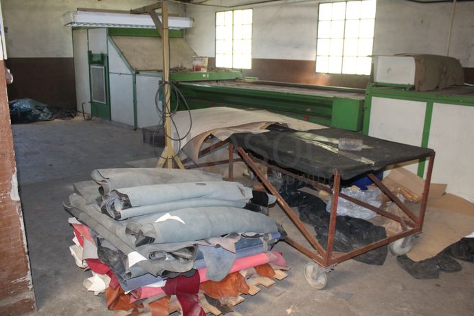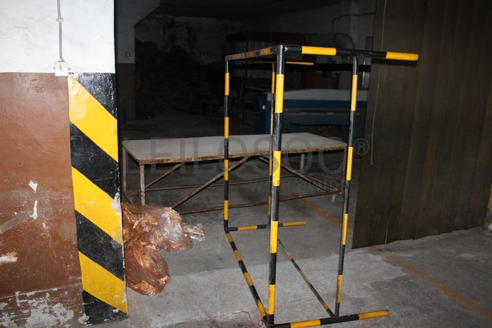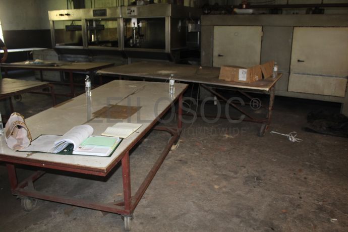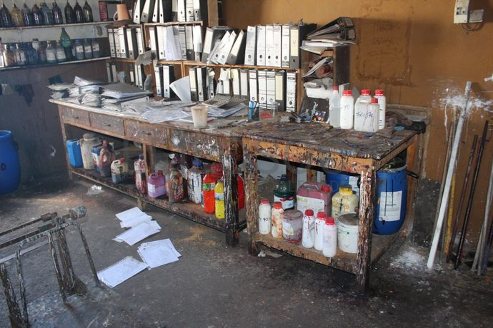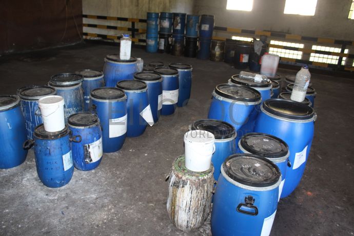 - Balança e respetivos pesos, bancada de madeira, tintas, bancadas metálicas com rodas, 2 balanças, restos de produtos químicos, escada, estrutura metálica, 2 chuveiros, bidons, secretária, racks