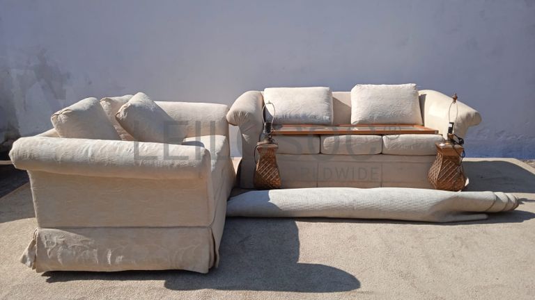 Dois sofás um de três lugares, um de dois lugares, um tapete, dois candeeiros e um espelho