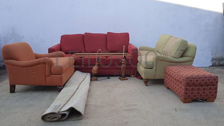 Três sofás um de três lugares, um de dois lugares, um de um lugar, um puff, um tapete, dois candeeiros e um espelho
