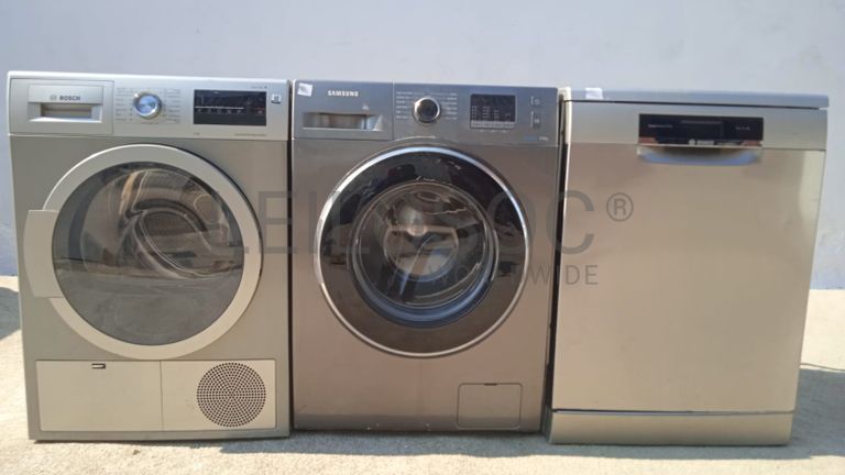 Uma máquina de lavar roupa marca Samsung, uma de secar roupa marca Bosch e uma de lavar loiça marca Bosch