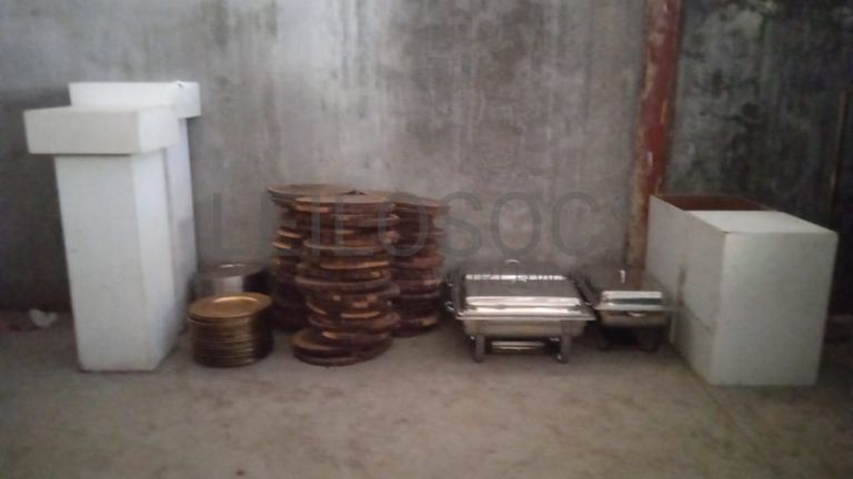 Cento sessenta e sete tábuas, três banho Maria, cinco vasos decorativos, cento e sete pratos metálicos e cento noventa e cinco pratos plásticos