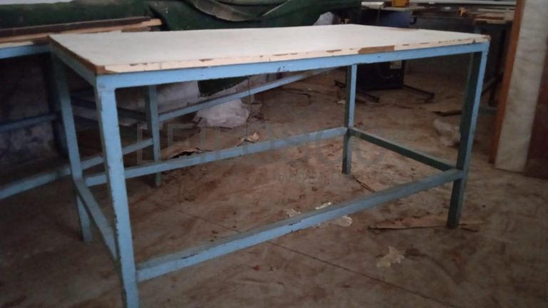 Mesa de trabalho, de base metálica com tampo de madeira.