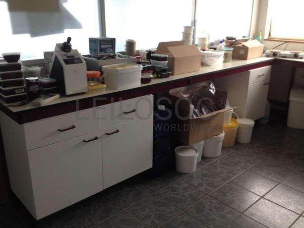 o Bancada com estrutura metálica e tampo felónico · Bancadas Metálicas · Conjunto de tubos e boiões de vidro · Estufas · Bomba de Trasfega Caldas · Torno Azul.