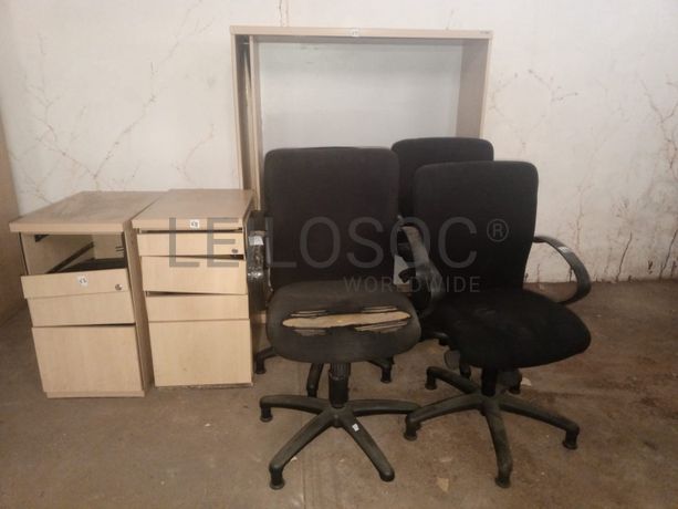 Um armário, dois blocos rodados e quatro cadeiras giratórias