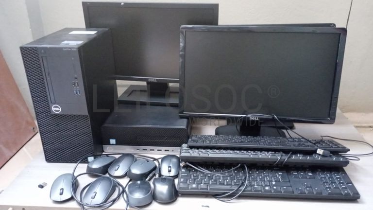 Três monitores de marca Dell, três teclados e oito Mouses