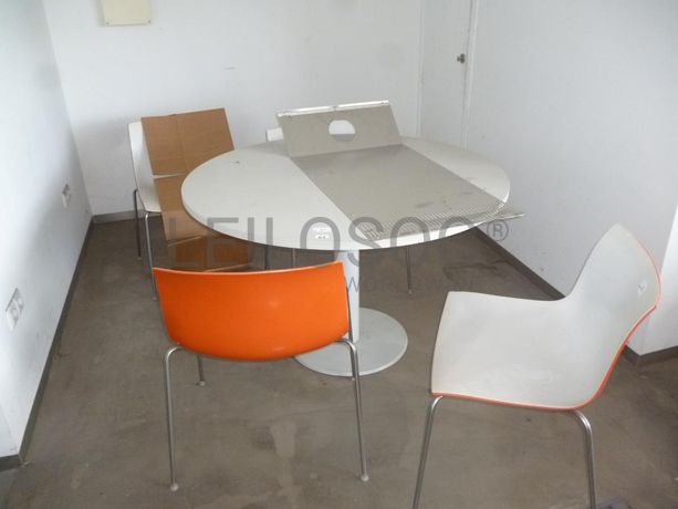 - Mesa redonda com 4 cadeiras de cor branca e laranja