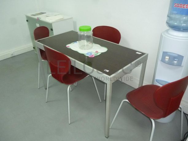- Mesa de cozinha com 4 cadeiras fixas, plásticas vermelhas
