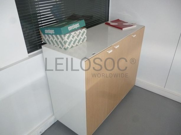 - 2 Secretárias estrutura metálica e tampo castanho, com bloco de 3 gavetas