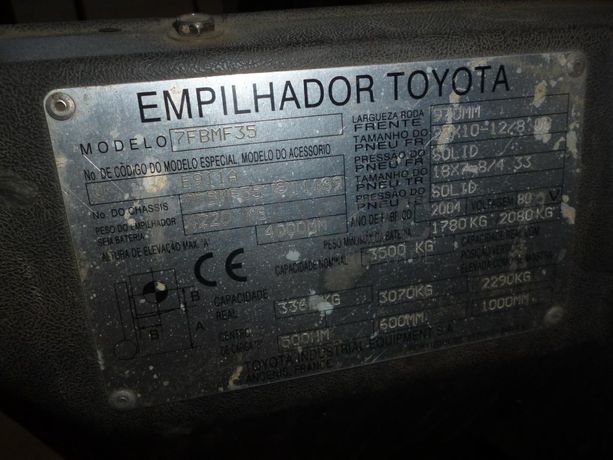 - Empilhador Toyota, modelo 7FBMF35, tonelagem 4220, altura 4m, ano 2004, 23.648 horas de trabalho
