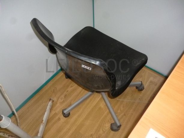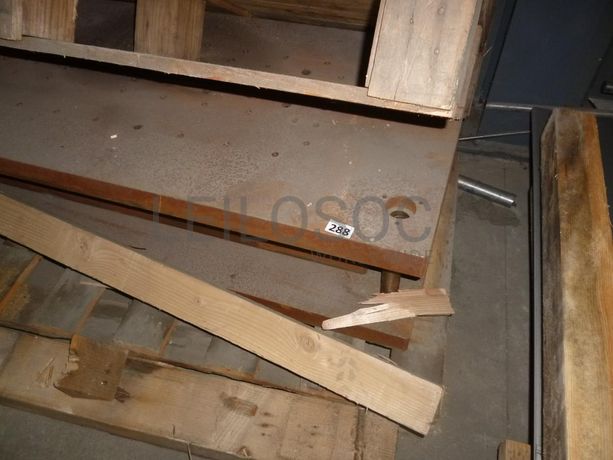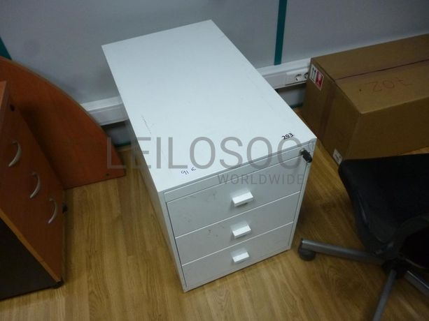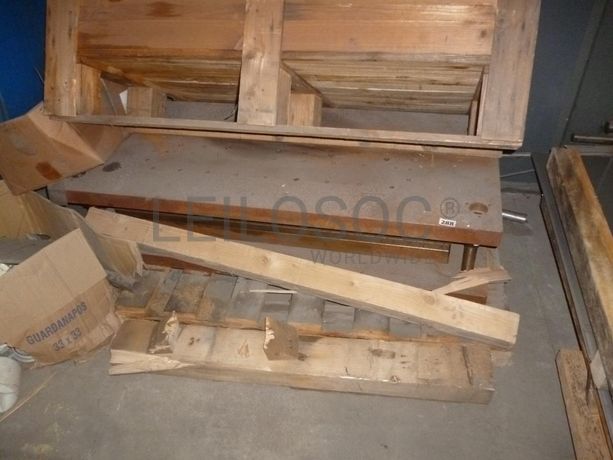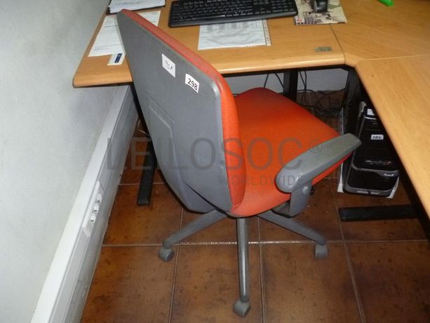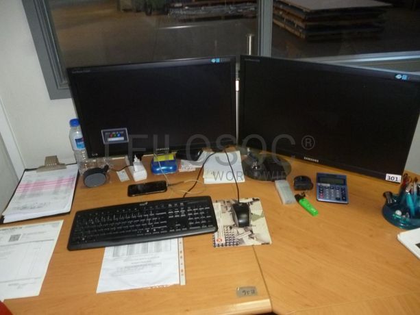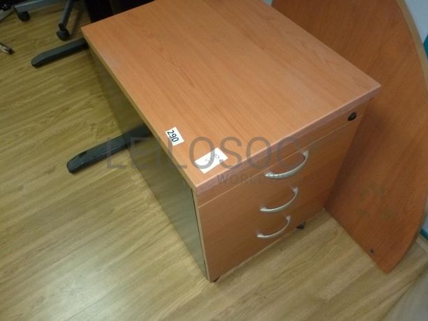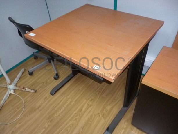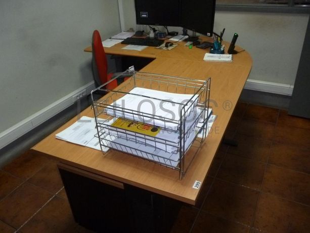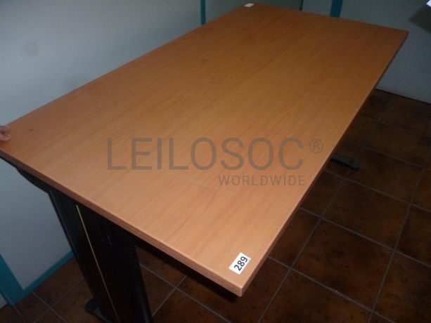 - Secretária em estrutura metálica, com tampo de cor castanho claro