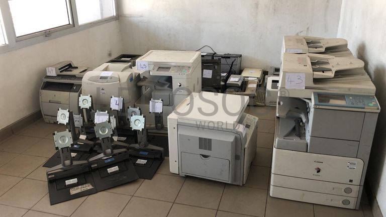 Un lot complet d'équipements de bureau comprenant divers articles de technologie et mobilier, idéal pour équiper un espace de travail. Ce lot inclut des ordinateurs, imprimantes, destructeurs de papier et autres matériels essentiels pour un environnement de bureau moderne.