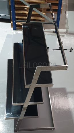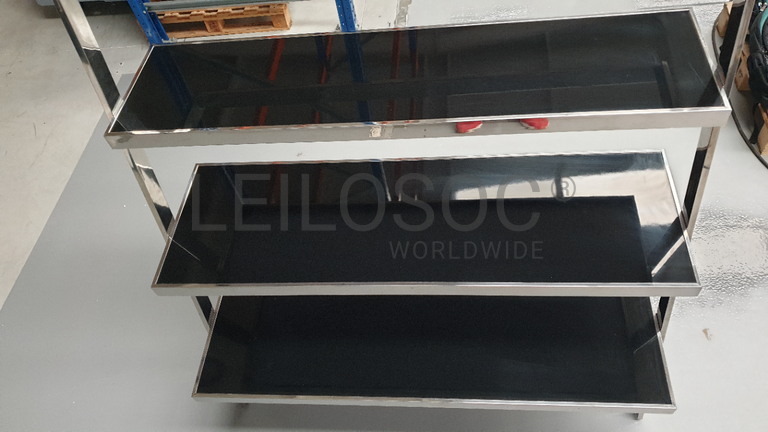 Expositor com 3 prateleiras cromadas e lacadas a preto brilhante muito elegantes.