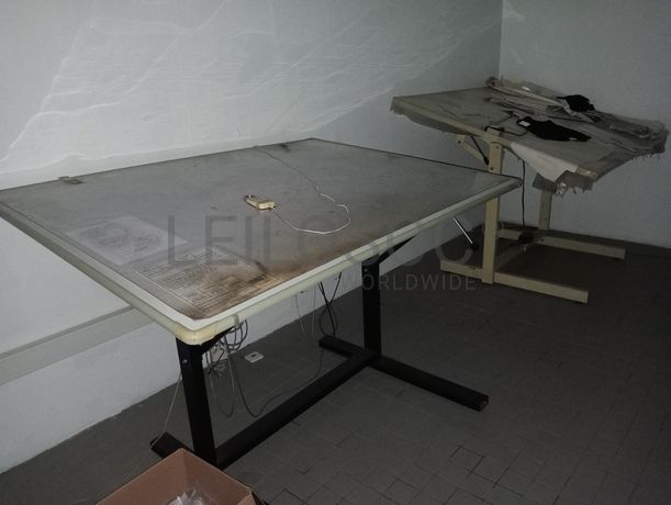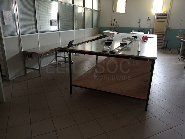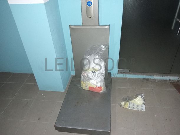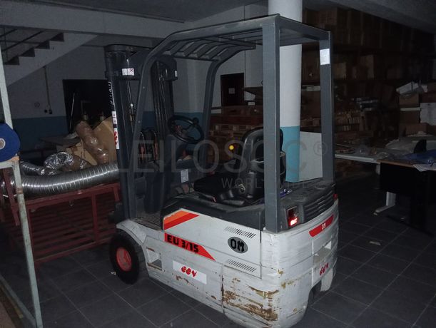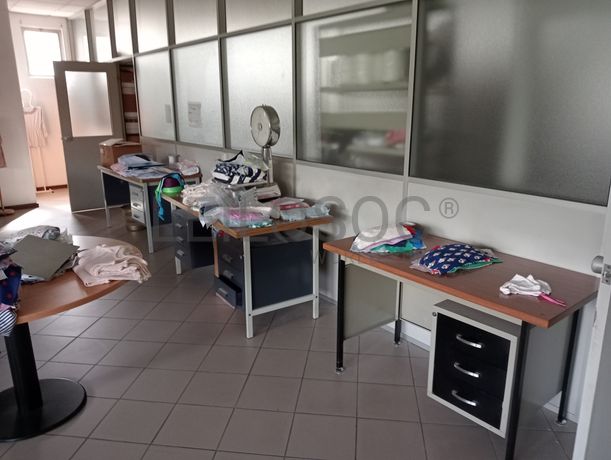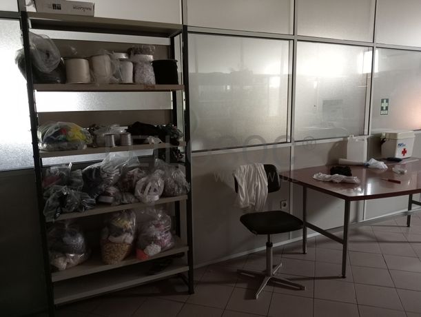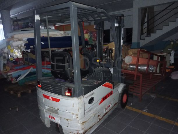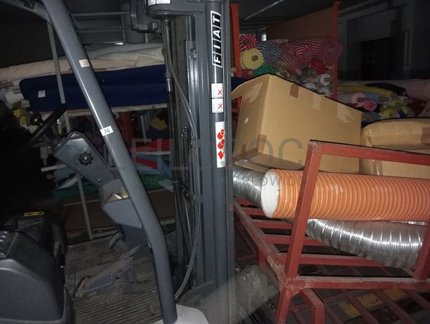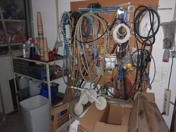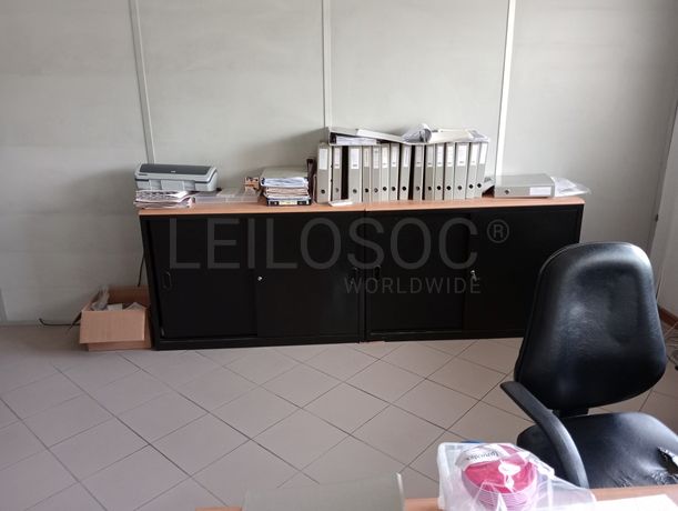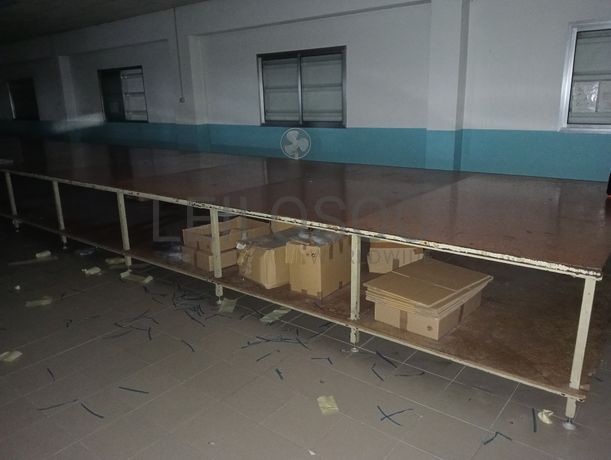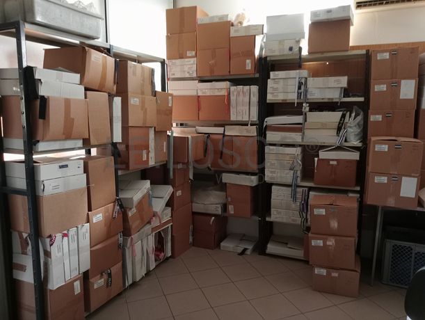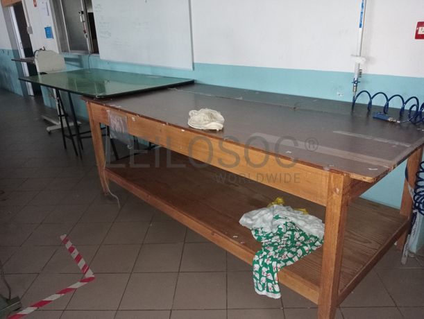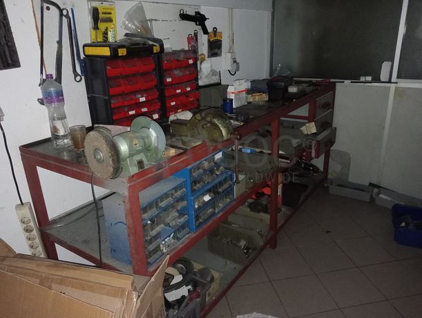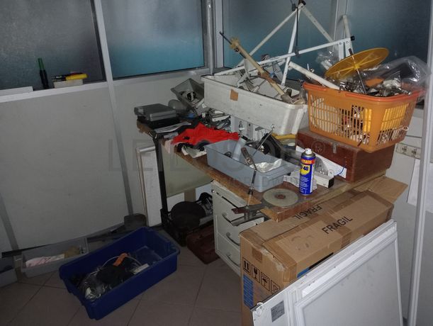 Empilhador elétrico · Porta paletes · Balanças · Módulos de estante em dexion · Mesas de passar com ferro · Mesa de remate · Lote de linhas · Bancada com torno e esmeril · Ferramentas manuais · Peças usadas de substituição · Detetor de metais · Máquinas de secar · Máquinas de lavar · Máquina de plastificar pendurados · Cestos · Compressor