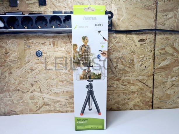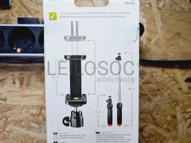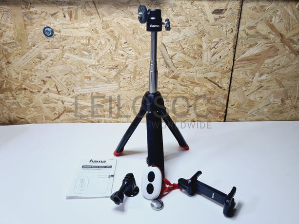 Tripé multifuncional para selfies compatível com smartphones, GoPro e câmaras, com mando Bluetooth e suportes para telemóvel.