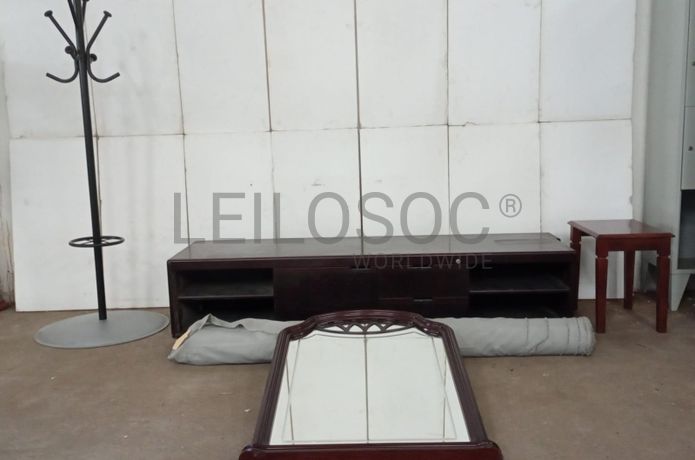 Uma estante para TV, um bengaleiro, um espelho, suporte para tapete e uma mesinha de canto