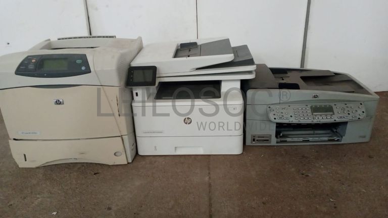 Três impressoras de marca HP, modelos 4250n, e MFP M426fdn, SN CN674CK6WP, PHB8J4J8MV, CNHXR24504
