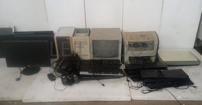Seis monitores, cinco de marca HP, um de marca Panasonic, dois PCs um de marca Fujitsu e um de marca HP, uma impressora marca HP e um scanner marca HP, quinze teclados e dezasseis mouses