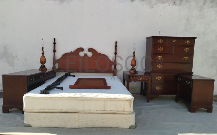 Uma cama de casal, uma cómoda, quatro mesinhas de cabeceira, dois candeeiros, um encosto de cama, um espelho e duas bases de ferro