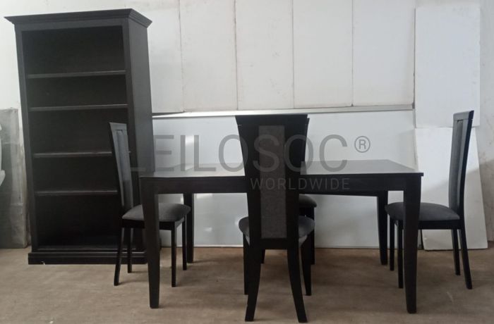 Uma mesa de jantar, quatro cadeiras e um armário