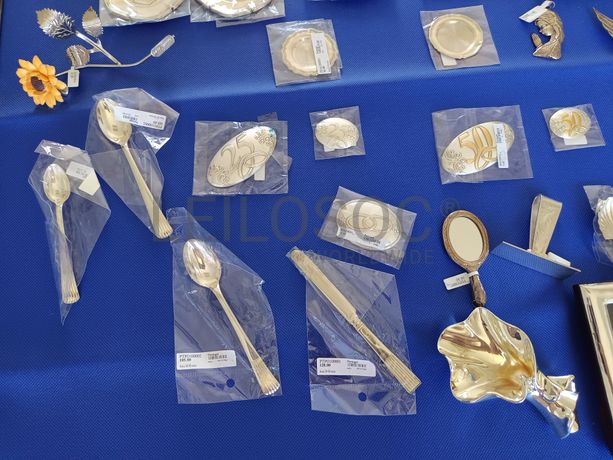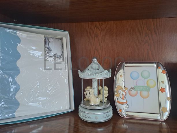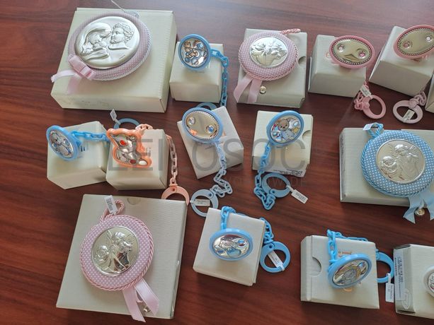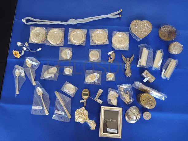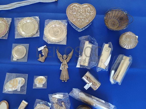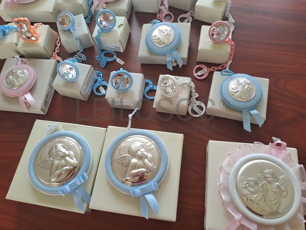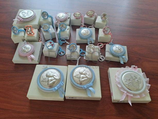 - Diversos relógios e braceletes, alianças, colares, brincos e pulseiras, porta-chupetas, medalhas de berço com anjo da guarda, talheres, salvas, anjos, guarda jóias, porta retratos;