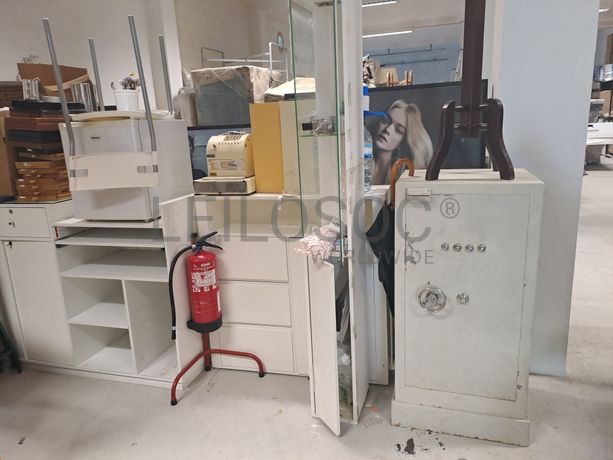 - 2 Cadeiras de escritório; mobiliário diverso, 1 cofre, 1 escadote,