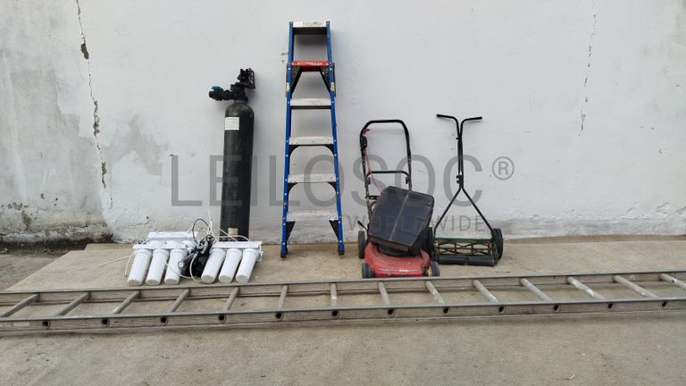 Duas escadotes, duas máquinas de cortar relva, um purificador de água e cinco filtros de água