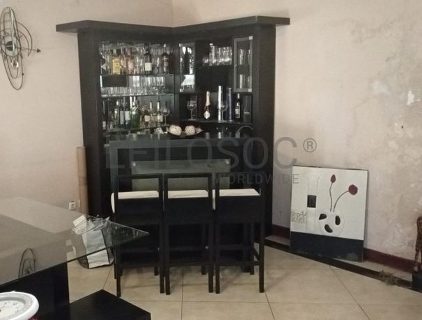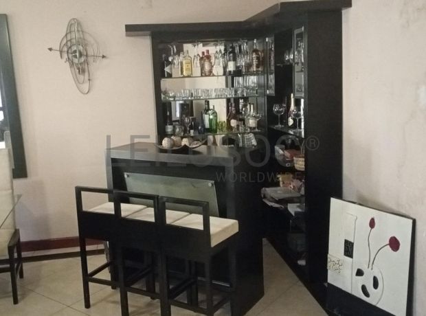 Um home bar, Um balcão, Três bancos altos, Um quadro, e uma estátua.