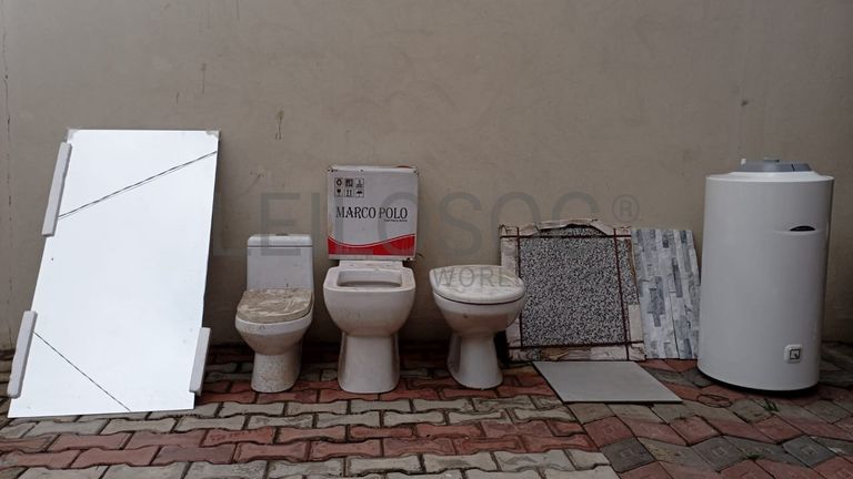 Um espelho, oito sanitas, sendo seis para crianças, dois autoclismo, cerca de sessenta tijoleiras diversas,
