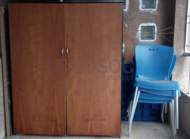 Um armário de duas portas, Sete cadeiras, Três caixas plásticas e uma mini secretária.