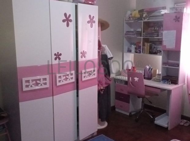 Um guarda roupa, uma secretária com estante, e uma cadeira giratória