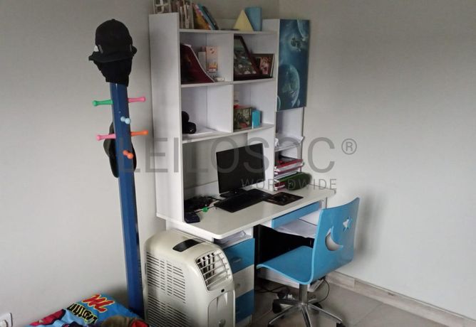 Uma secretária com estante, Uma cadeira giratória,