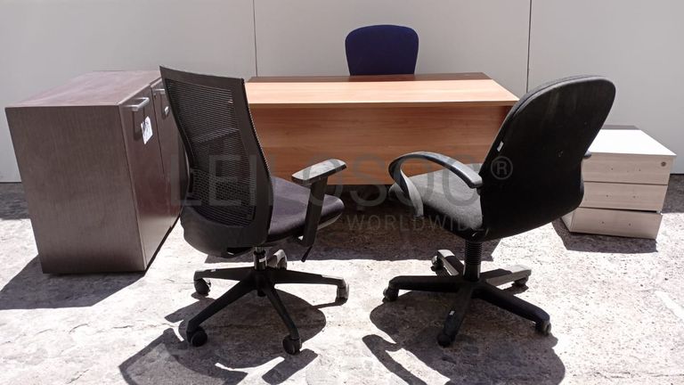 Duas secretária uma em mau estado, três cadeiras giratórias, um armário sem a parte traseira, e um bloco rodado