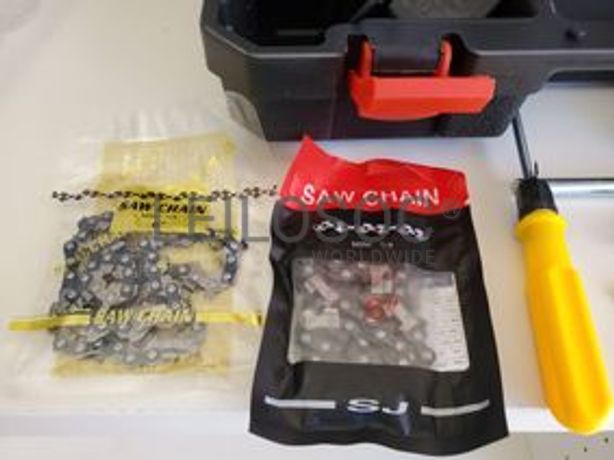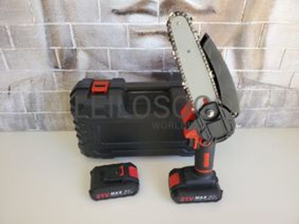 Motosserra elétrica com lâmina de 6 polegadas, com duas baterias incluídas, duas correntes de corte, carregador incluído e chaves como acessórios.