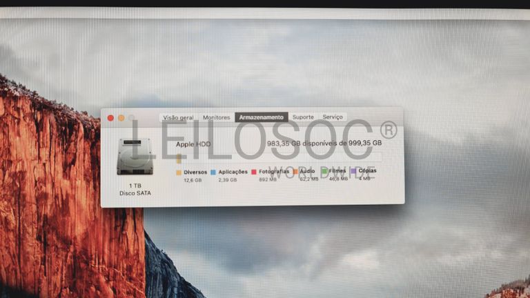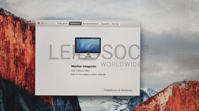 Computador Apple iMac A1418, All In One, com processador Intel Core i5, memória RAM de 8GB, disco HDD de 1TB com sistema, ecrã Full HD integrado de 21.5" e sistema operativo macOS X El Capitan.
