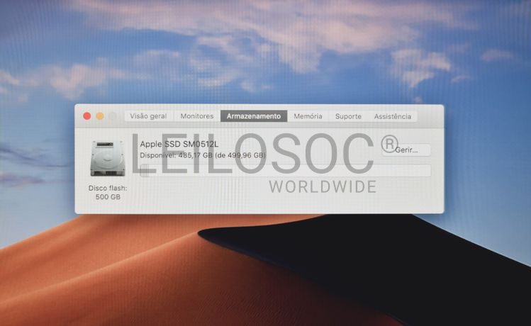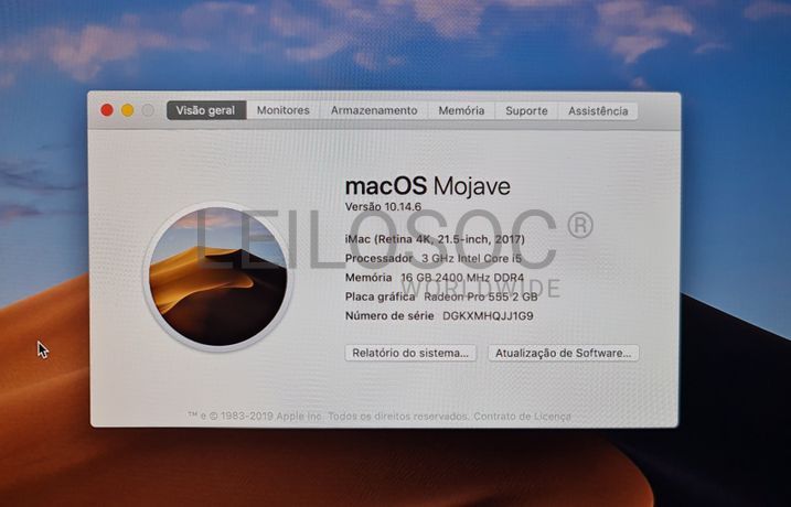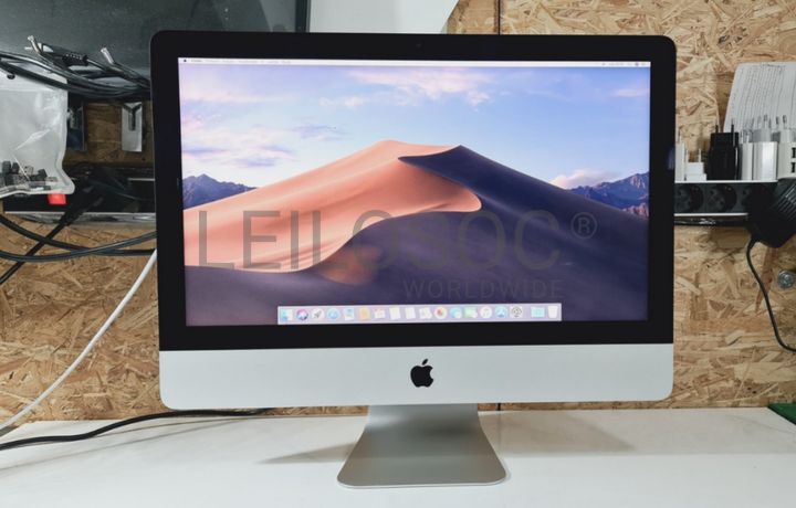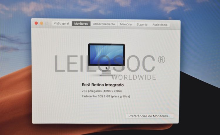 Computador Apple iMac A1418, All In One, com processador Intel Core i5, memória RAM de 16GB, disco SSD de 512GB com sistema, ecrã retina 4k integrado de 21.5", placa gráfica Radeon Pro 555 de 2GB e sistema operativo macOS Mojave.