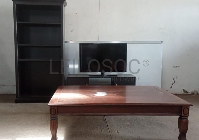 Uma TV marca Samsung, uma estante para TV, uma mesa de centro e uma estante