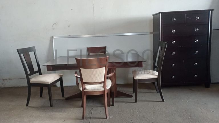 Uma mesa de jantar, quatro cadeiras e uma cómoda